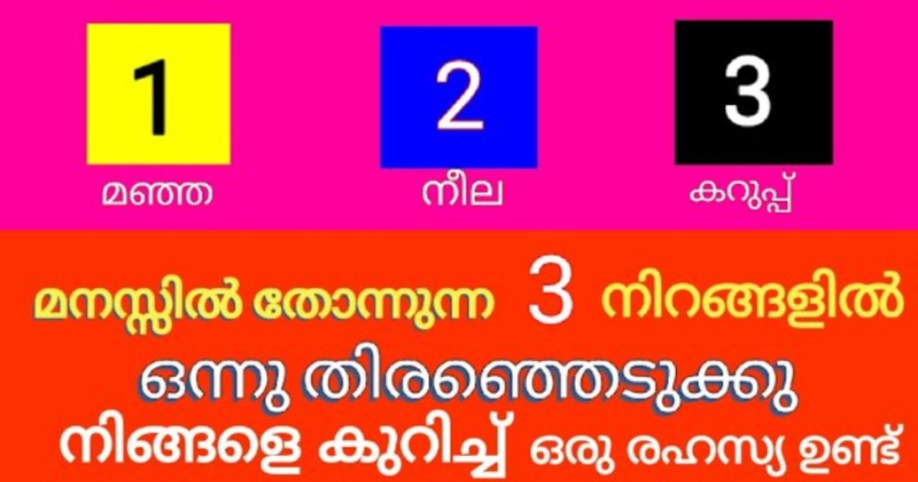 Select A Color : ഒന്നാമത്തെ നിറം മഞ്ഞയും രണ്ടാമത്തെ നിറം നീലയും മൂന്നാമത്തെ നിറം കറുപ്പും ആണ്. നിങ്ങൾ ഇതിൽ ഇഷ്ടപെട്ട ഏതെങ്കിലും ഒരു നിറം തിരഞ്ഞെടുക്കൂ.. ആ നിറം നിങ്ങളെ പറ്റി രഹസ്യങ്ങളും പൊതുവെയുള്ള ചില സ്വഭാവങ്ങളും പല കാര്യങ്ങളും വെളിപ്പെടുത്തും. ഒന്നാമത്തെ നിറം ‘മഞ്ഞ’. നിങ്ങൾ തിരഞ്ഞെടുത്ത നിറം മഞ്ഞയാണ് എങ്കിൽ അൽപ്പം ഉദാസീനയരായിരിക്കും ഇക്കൂട്ടർ. പൊതുവെ സന്തോഷം കുറവാണ് പ്രകടമാക്കുന്നത്. ഇപ്പോഴും ചിന്തയിൽ മുഴുകിയിരിക്കും.